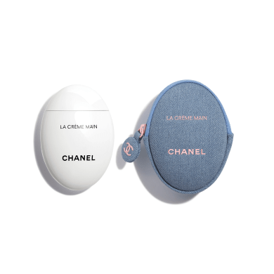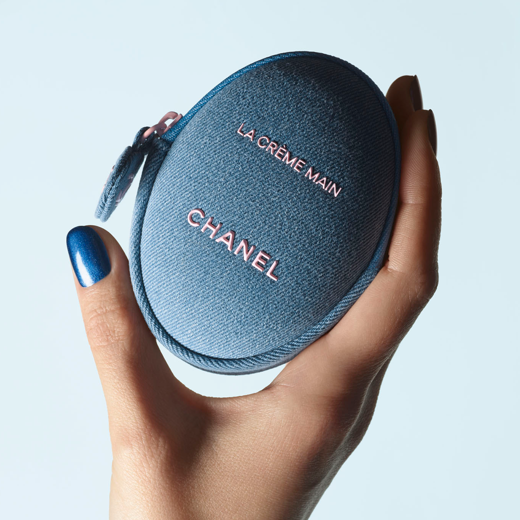 シャネルのアイコニックなハンドクリーム ラ クレーム マン テクスチャー ドゥースが デニムの限定ポーチをまとって登場。 うるおいに満ちた手肌のために持ち歩きたいアイテム。