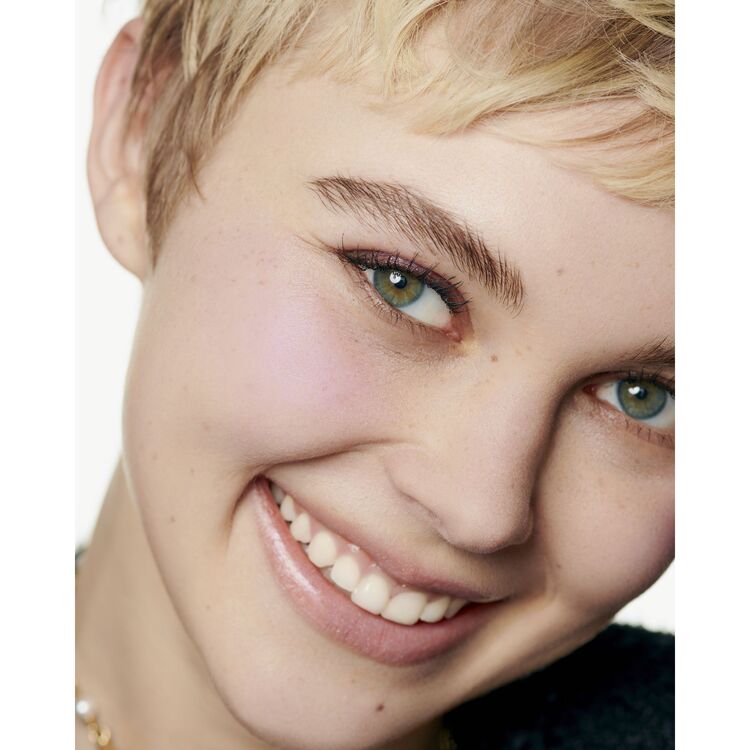 多彩なきらめきを放つ肌に仕上げる特別限定品、ココ デニム。ブルーとピンクのパールがきらめくパウダー ハイライターです。表面には、クチュールを思わせるトップステッチ ディテールのダブルCがかたどられています。