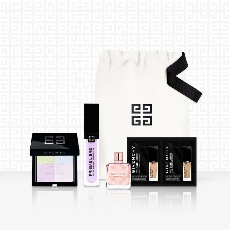2025年8月にリニューアルをした“光と色の交錯”で織り上げる、透明美マット肌を叶える「プリズム・リーブル・プレストパウダー」と、透明感あふれる明るさをもたらし、ケアしながら*1肌のトーンを整える*2「プリズム・リーブル・スキンケアリング・コレクター」の新シェードに、ジバンシイのアイコニックなフレグランスである「イレジスティブル オーデパルファム」のミニサイズ、人気ファンデーションサンプル、コットン ポーチがついたスペシャルキット。
