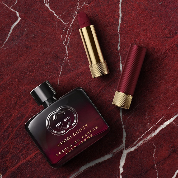 グッチ ギルティ アプソリュ ド パルファムのボトルデザインは、香りに宿る特別な価値を映し出しています。ラッカー仕上げのグラデーションガラスは、上部は不透明で、ボトムにいくにつれて透明になり、内側にある輝く香りをほのかにのぞかせます。ボトルは、グッチを象徴する2つのカラー ――For himのグリーン、For herのレッド――で彩られ、中央にはエンボス加工のインターロッキングGのロゴがあしらわれています。ブラックキャップとゴールドのレタリングで仕上げられたボトルは、2つの香りの間に洗練されたバランス感を表現しています。いずれも、他のコレクションにはない60mLサイズで展開されます。