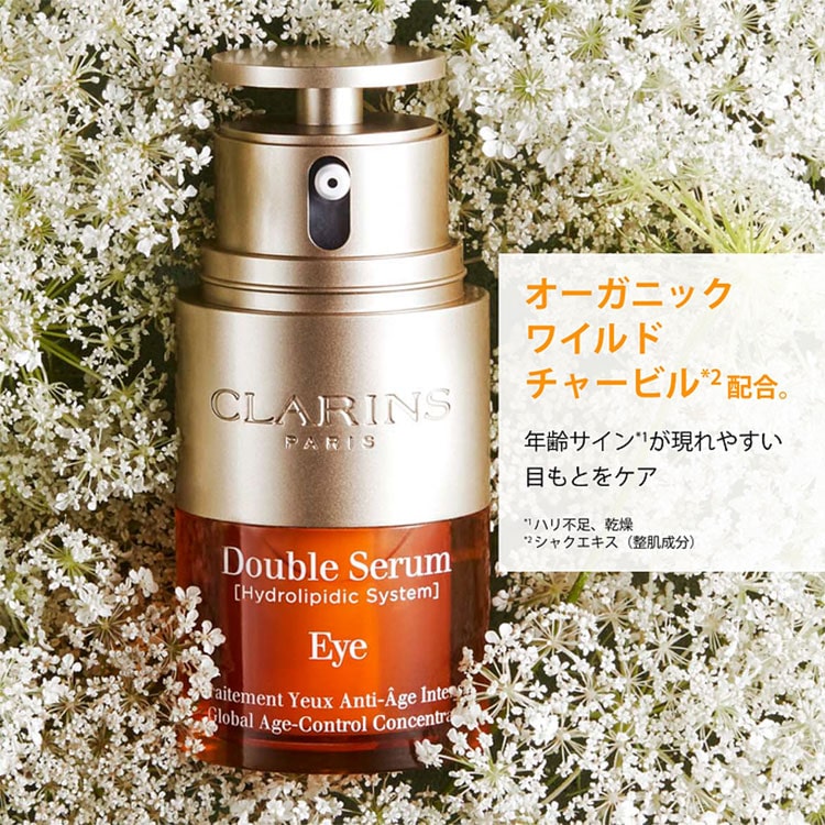 コスメ賞を多数受賞したクラランスのエイジングケア(*1)美容液「ダブル セーラム ADC」の現品と、クラランスを代表する目もと美容液「ダブル セーラム アイ」の現品にうるおいを与えるクレンジングや洗顔料、クリームのトライアルサイズをプラス。