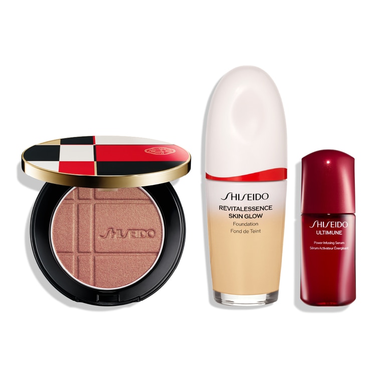 頬、目もとを艶やかに彩る新アイテム、カラー+グロウ エンハンサー 1 品と、SHISEIDO メーキャップの対象のファンデーション、パウダー、プライマーからお選びいただいた 1 品に、美容液アルティミューンの特製サイズをセット。メイクとスキンケアによる美しい仕上がりをぜひご体感ください。