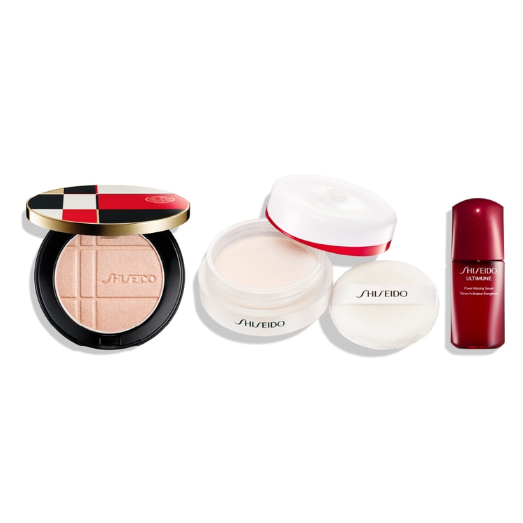 頬、目もとを艶やかに彩る新アイテム、カラー+グロウ エンハンサー 1 品と、SHISEIDO メーキャップの対象のファンデーション、パウダー、プライマーからお選びいただいた 1 品に、美容液アルティミューンの特製サイズをセット。メイクとスキンケアによる美しい仕上がりをぜひご体感ください。