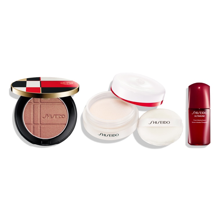 頬、目もとを艶やかに彩る新アイテム、カラー+グロウ エンハンサー 1 品と、SHISEIDO メーキャップの対象のファンデーション、パウダー、プライマーからお選びいただいた 1 品に、美容液アルティミューンの特製サイズをセット。メイクとスキンケアによる美しい仕上がりをぜひご体感ください。