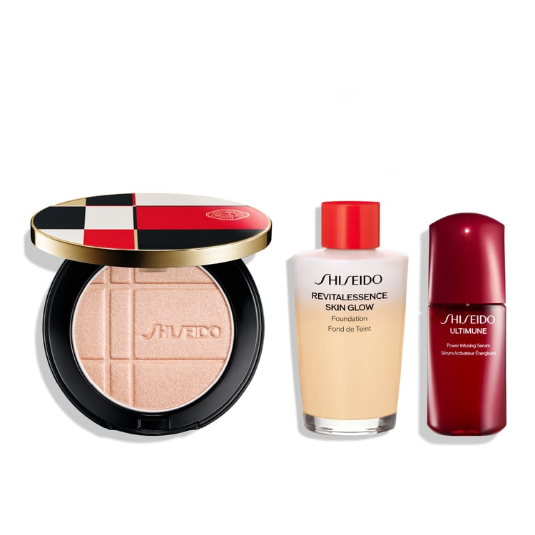 頬、目もとを艶やかに彩る新アイテム、カラー+グロウ エンハンサー 1 品と、SHISEIDO メーキャップの対象のファンデーション、パウダー、プライマーからお選びいただいた 1 品に、美容液アルティミューンの特製サイズをセット。メイクとスキンケアによる美しい仕上がりをぜひご体感ください。