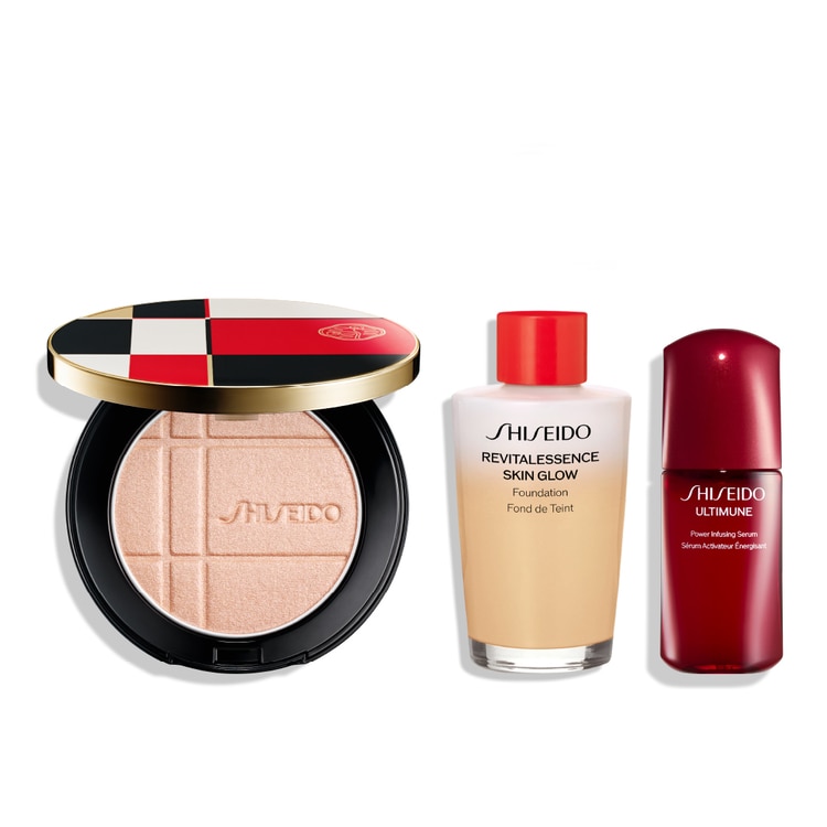 頬、目もとを艶やかに彩る新アイテム、カラー+グロウ エンハンサー 1 品と、SHISEIDO メーキャップの対象のファンデーション、パウダー、プライマーからお選びいただいた 1 品に、美容液アルティミューンの特製サイズをセット。メイクとスキンケアによる美しい仕上がりをぜひご体感ください。