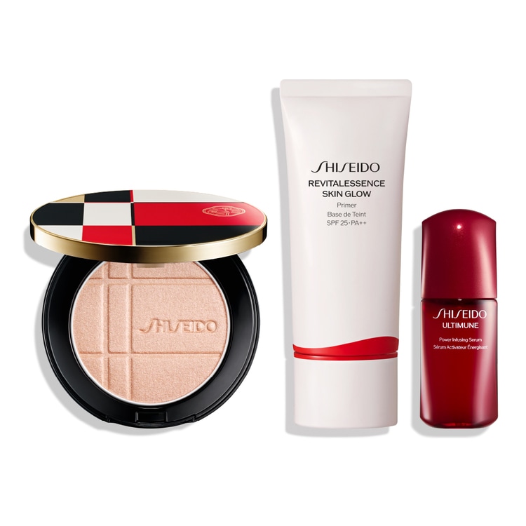 頬、目もとを艶やかに彩る新アイテム、カラー+グロウ エンハンサー 1 品と、SHISEIDO メーキャップの対象のファンデーション、パウダー、プライマーからお選びいただいた 1 品に、美容液アルティミューンの特製サイズをセット。メイクとスキンケアによる美しい仕上がりをぜひご体感ください。