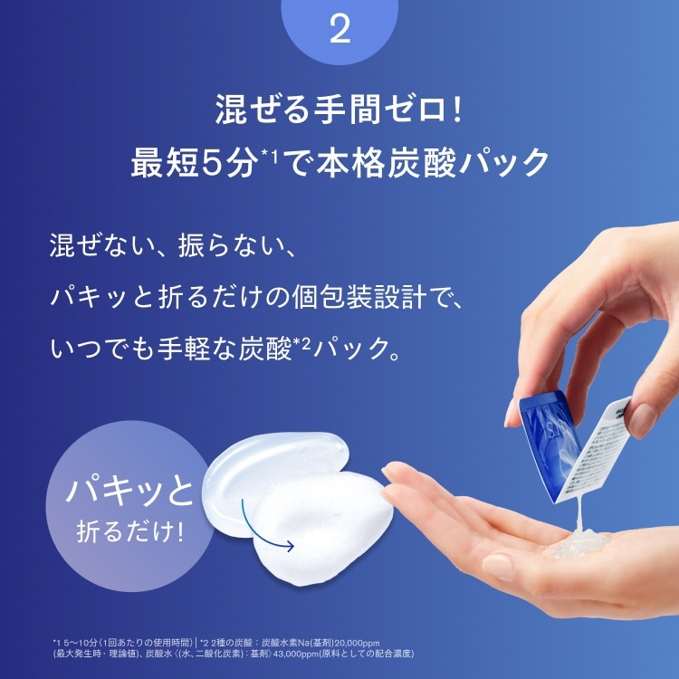 パキッと折ると出てくる炭酸*1ジェルをそのまま肌に乗せ、5分程度置いたら洗い流すだけ。