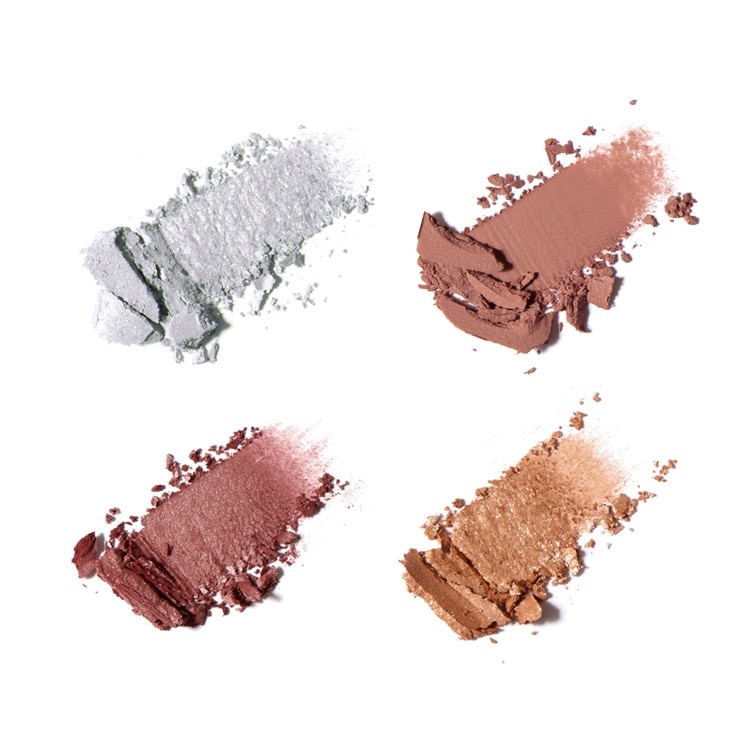モダンな陰影を演出するベージュ×キャメルに、クリアにきらめくローズニュアンスのブラウンと、大粒のピンクがきらめくスパークルカラーを合わせて。知性の奥にまろやかな高揚感が目覚めるパレット。