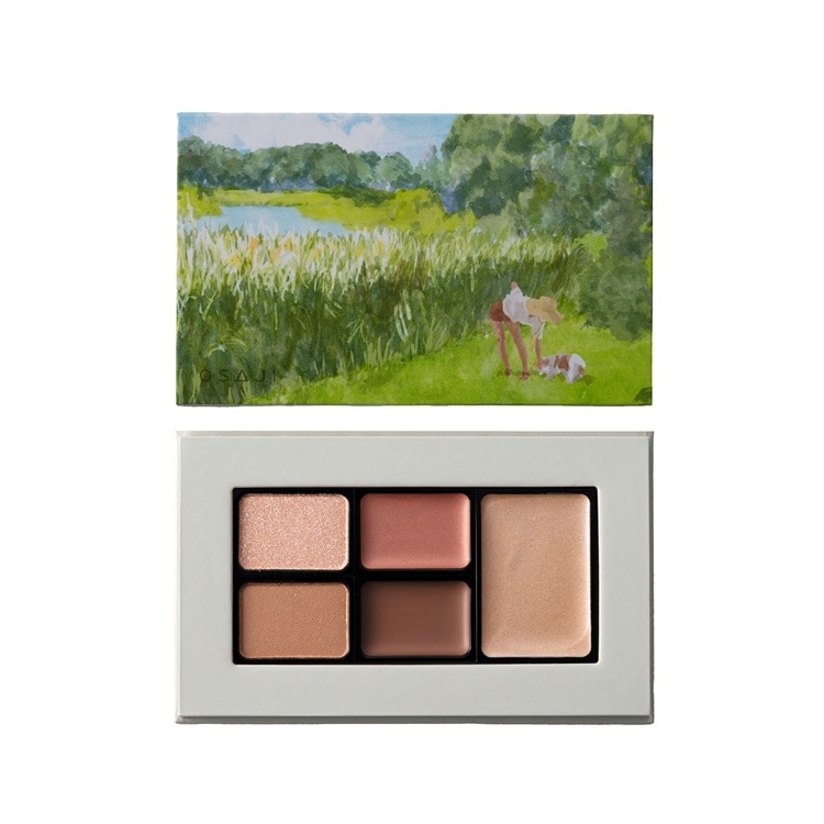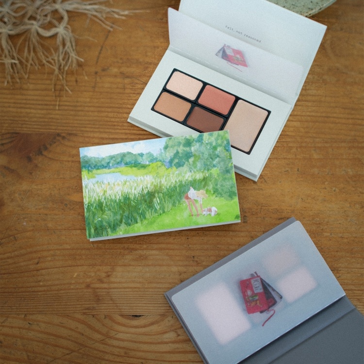 2色のパウダーカラーと3色のクリームカラーをインした、マルチに活躍するメイクアップパレット。パウダーはアイ・チークに、クリームはアイ・チーク・リップにお使いいただけるため、何通りものメイクアップを楽しむことができます。自由な強度で立体感や血色感を引き立てながら、重ねて、ずらして、多彩な表情をお楽しみください。イラストレーター・よしいちひろ氏が描く風景を施した、アートピースのような佇まいも魅力。メイクしている間、乾燥による肌荒れを防ぎながら、肌のうるおいを守ります。