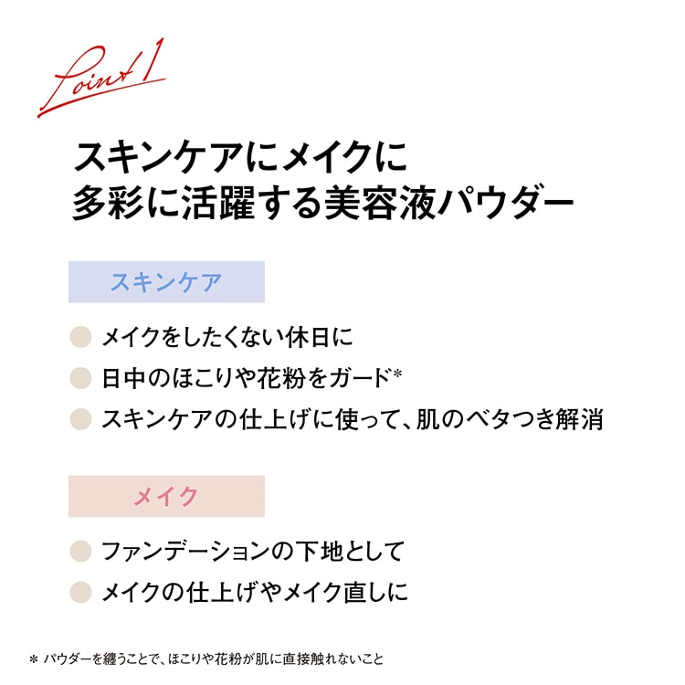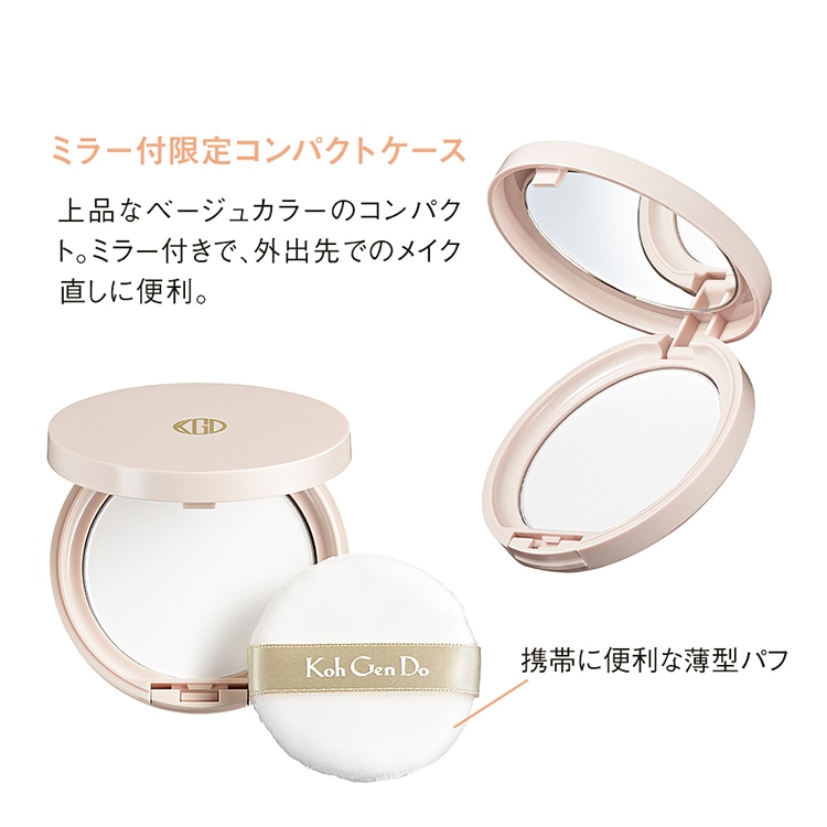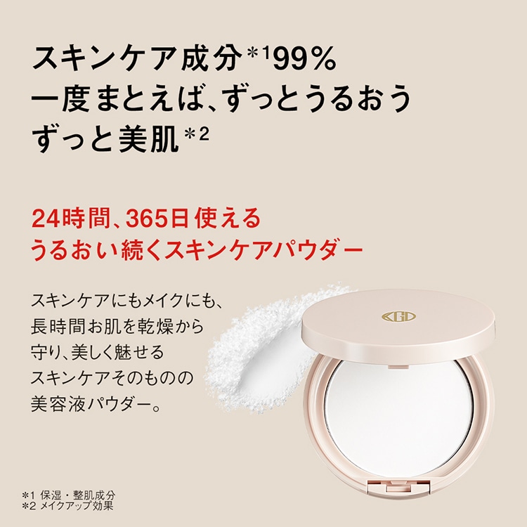 ミラー付き限定コンパクト。シルクのようなやわらかな質感で、肌にすっととけこむようになじんで保湿感をキープ。肌を滑らかに整えるアミノ酸系パウダーをメインに厳選されたスキンケア成分で構成された、美容液ならぬ美容粉。