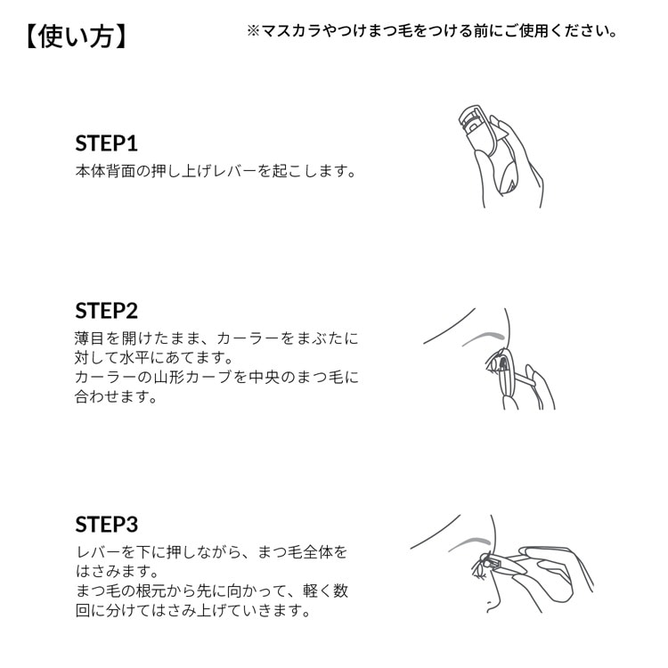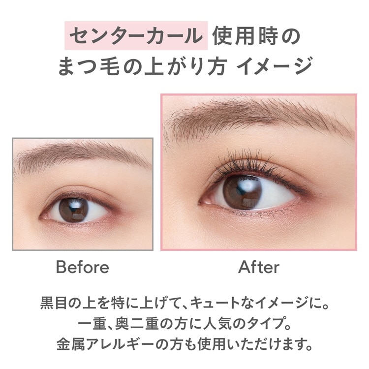「アイラッシュカーラー」でまつ毛を上げるときに、「コスメティックミラー」をセットで使うと、まつ毛をとらえやすく便利。本セットのアイラッシュカーラーは、山型のシェイプで、目の中央、黒目の上のまつ毛を特にくるっと上げるセンターカールタイプ。縦のラインを強調して目を大きく見せてくれ、キュートな目元をつくります。一重、奥二重の方に人気のタイプ。金属アレルギーの方も安心して使用いただけます。