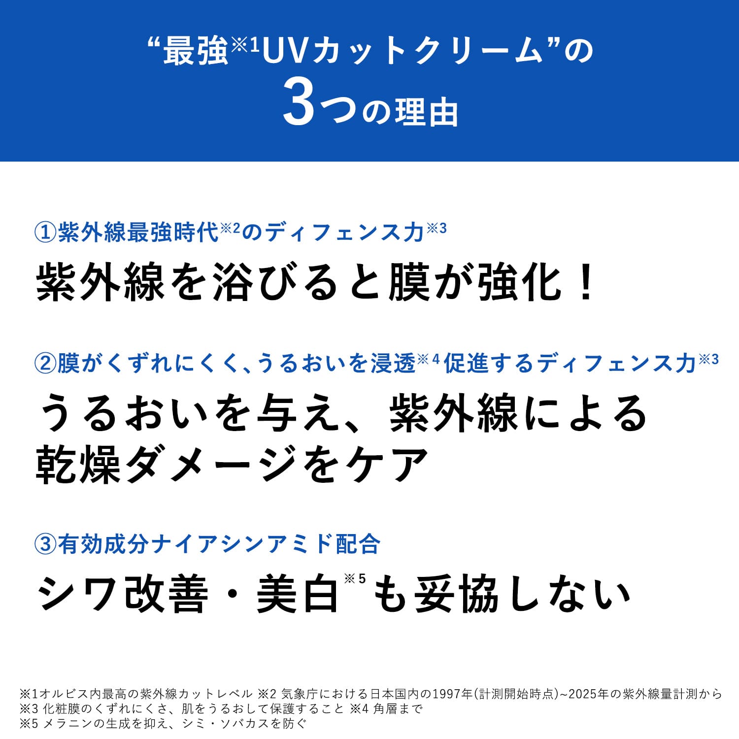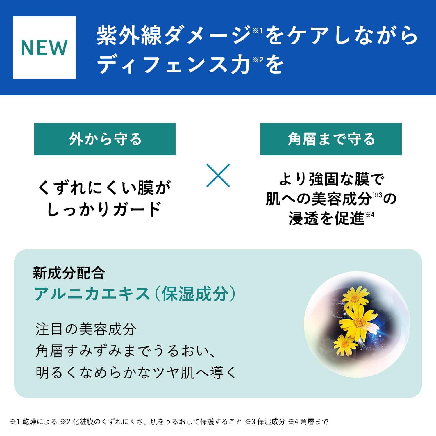 *1 気象庁における日本国内の1997年(計測開始時点)~2025年の紫外線量計測値から *2 メラニンの生成を抑え、シミ・ソバカスを防ぐ *3 化粧膜のくずれにくさ、肌をうるおして保護すること *4 アルニカエキス配合=うるおって明るくなめらかな肌に導く保湿成分