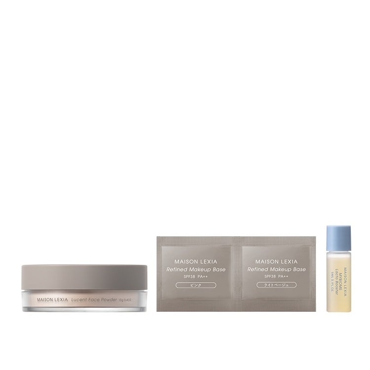 <ルーセント フェイスパウダー(ナチュラル)>に、ヤチヤナギ乳酸菌培養液*1や「フェイスバランスコンプレックス*2」など、独自に開発した美容成分がすこやかな肌を保つ導入美容液<ラクト ブースター>ミニボトルと、保湿効果のある植物成分を惜しみなく配合した化粧下地<リファインド メイクアップ ベース(ピンク・ライトベージュ)>のテスターがセットになったフェイスパウダー オープニングキット。