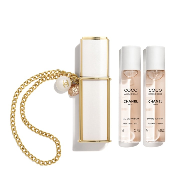 ジュエリーを思わせるココ マドモアゼル オードゥ パルファム パース スプレイ。ガラスパールとカメリアのチャームがあしらわれたゴールドのチェーンストラップを手首にまとい、どこにでも持ち歩いて。いつでも心のままに、フレッシュなアンバーの香りに奥行きを。
